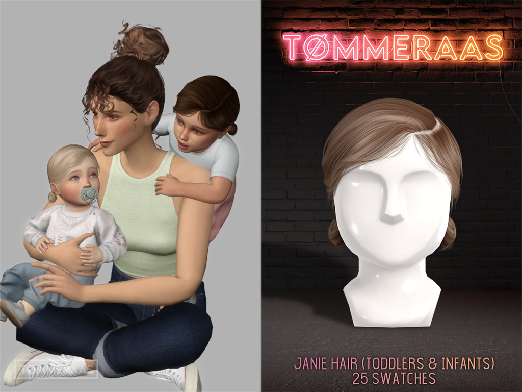Tommeraas-cc has created a stunning hair addition that is perfectly suited for both toddlers and infants. Multiple swatches let you express your Sims' unique style effortlessly. Download Janie Hair here