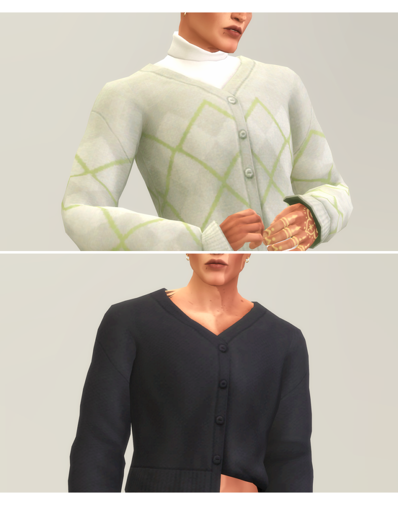 Two incredible cardigan variations from Rusty — a classic version and a stylish turtleneck variation — both featuring gorgeous swatches and impeccable maxis match quality. A community staple that constantly appears on CC curator must-have lists for male sim clothing.