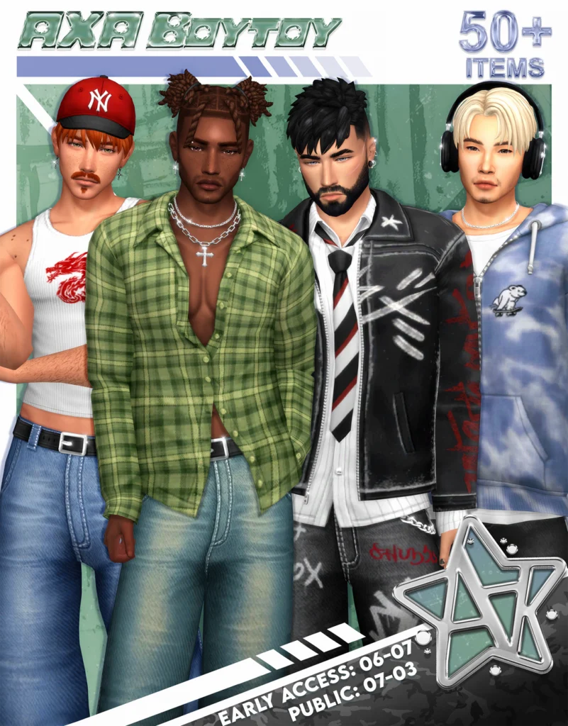 The definitive 2025 male CC collection — a staggering 50+ item pack featuring tanks, flannels, hoodies, cargo pants, hats, headphones, sneakers, accessories, and even a Labubu tote bag. Grungy, fruity, or a mix of both, this pack transforms every male sim wardrobe completely.