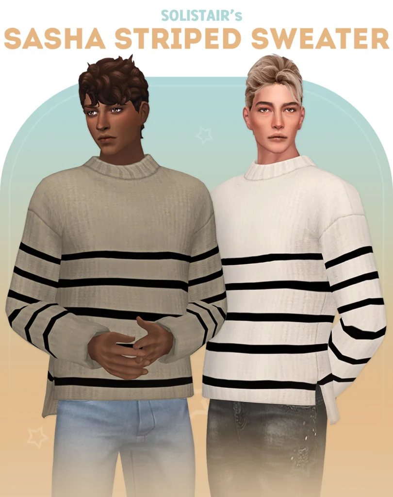 A gorgeous, textured striped sweater from the talented Solistair — instantly recognizable for its clean lines and beautifully balanced stripe patterns. This community-favorite piece appears consistently on male CC curator lists for its exceptional maxis match quality.