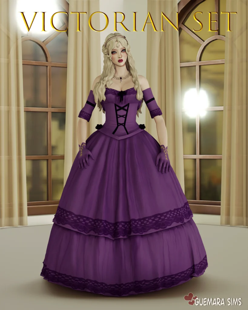 Three intricately detailed Victorian-inspired dresses alongside a classic necklace, elegant headband, long and short gloves, and ankle boots. A beautifully refined set that brings historical elegance and full coverage to any Sim's wardrobe.