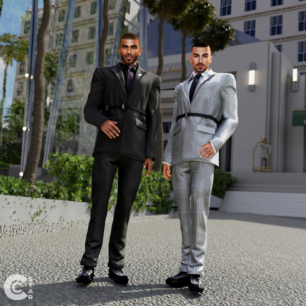 A sharp two-piece suit inspired by the look Damson Idris wore at Vanity Fair 2024 — single-breasted jacket with notch lapels and straight-cut trousers. Timeless suiting that's perfect for formal occasions and polished professional Sims.