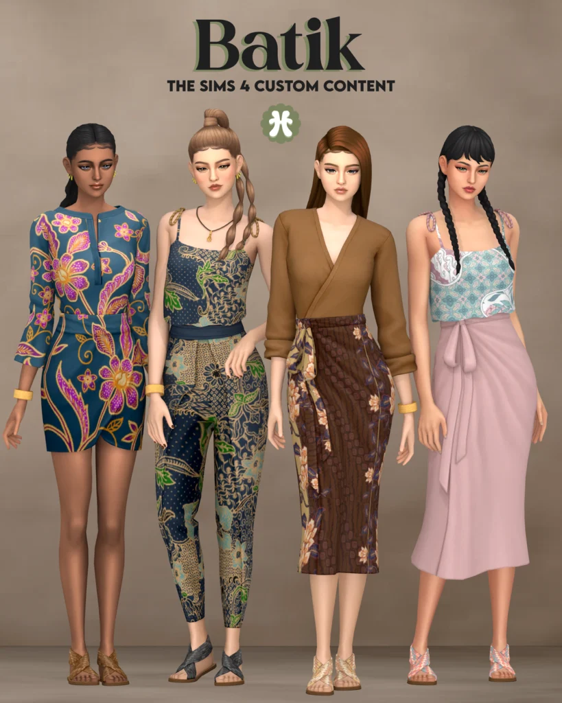 A beautiful cultural celebration of batik — the traditional textile art of Indonesia, Malaysia, Singapore, and Southeast Asia. This 8-item set for female Sims is base game compatible and features gorgeous authentic patterns throughout.