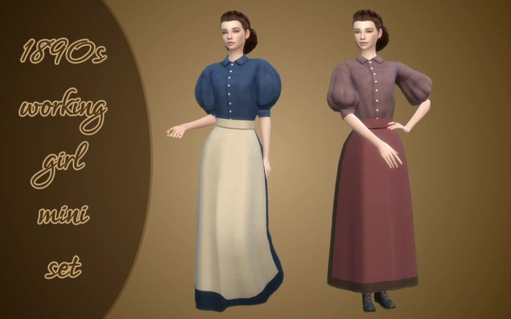 A set designed specifically for working-class 1890s Sims, inspired by Scottish fisherwomen. Includes woollen skirts in three lengths, an overlay apron, and two period-accurate blouses — modest, practical, and perfectly historically grounded.