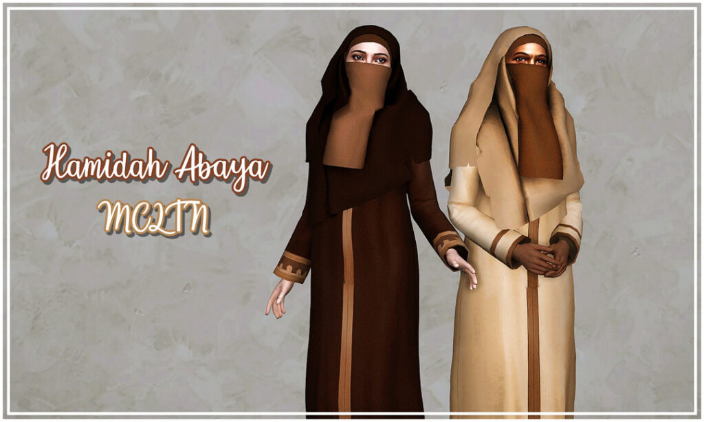 An intricately designed abaya available in around 30 colors, each in three versions: plain, with trimmings, and with lace on the sleeves. Includes a matching niqab recolor — one of the most detailed and thoughtful abayas in the entire Sims 4 CC community.
