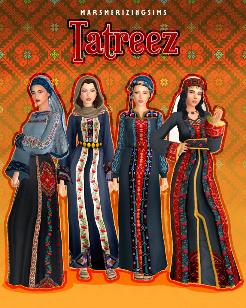 Inspired by the ancient art of Palestinian cross-stitch embroidery — a UNESCO-recognized cultural heritage — this set brings the stunning geometric patterns of traditional Palestinian clothing into The Sims 4. A meaningful and beautiful addition to any wardrobe.