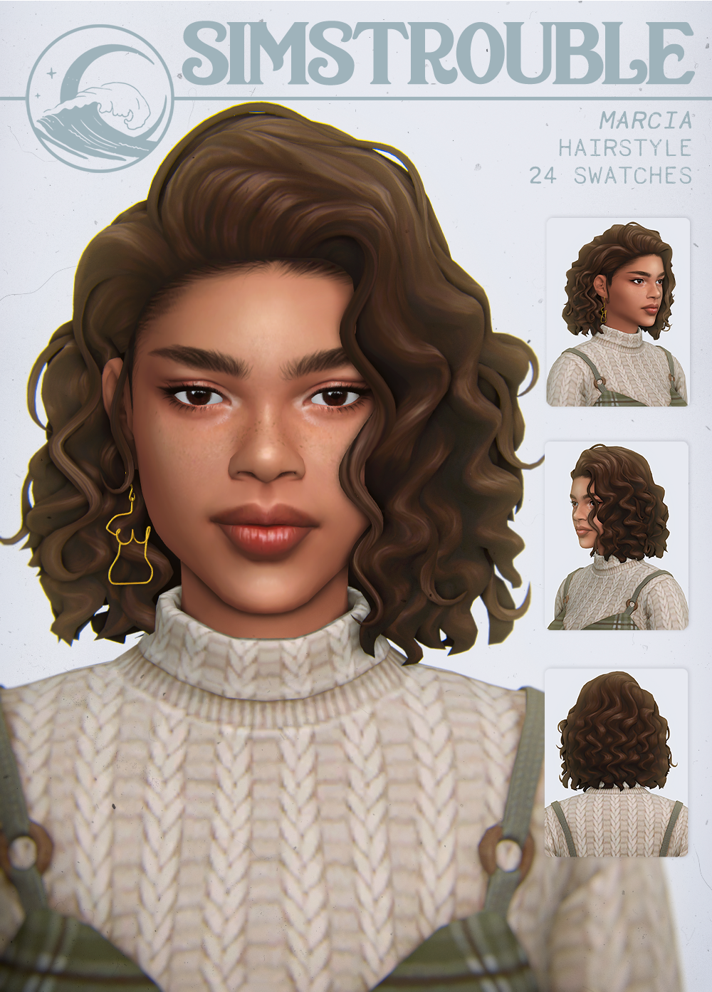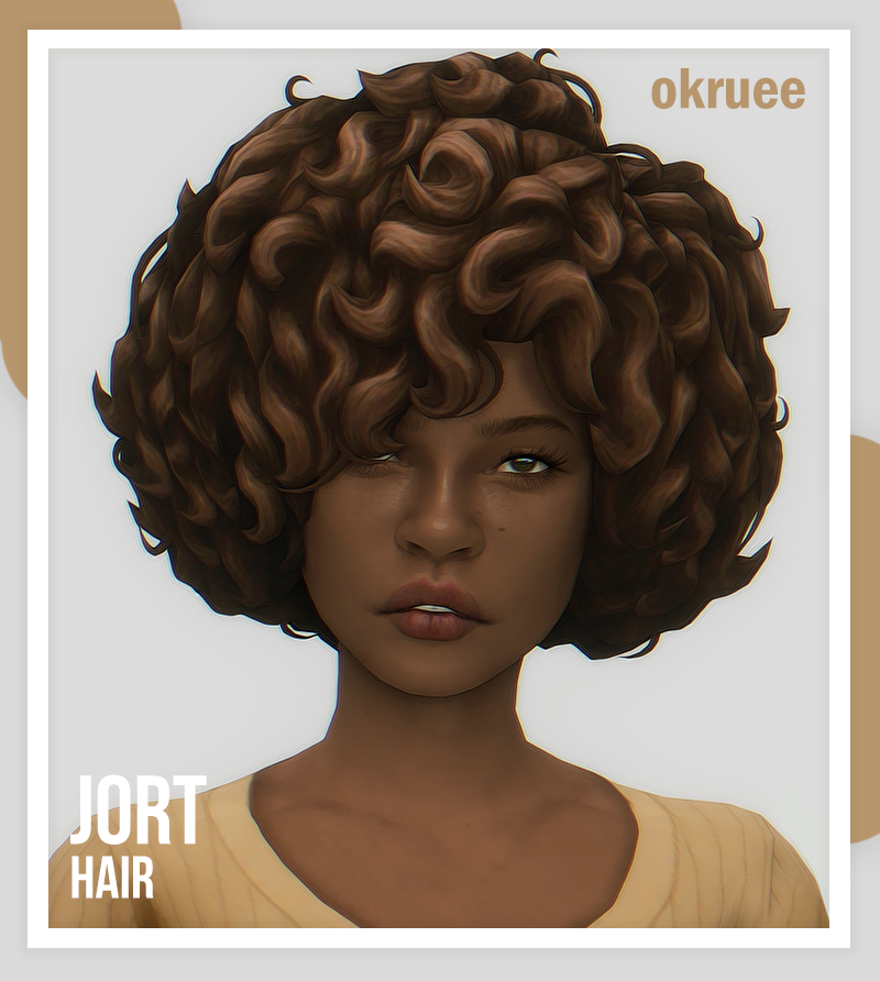 Curly afro with wavy, loose curls. Works on both male and female frames. Base game compatible and hat compatible with 24 EA swatches.
