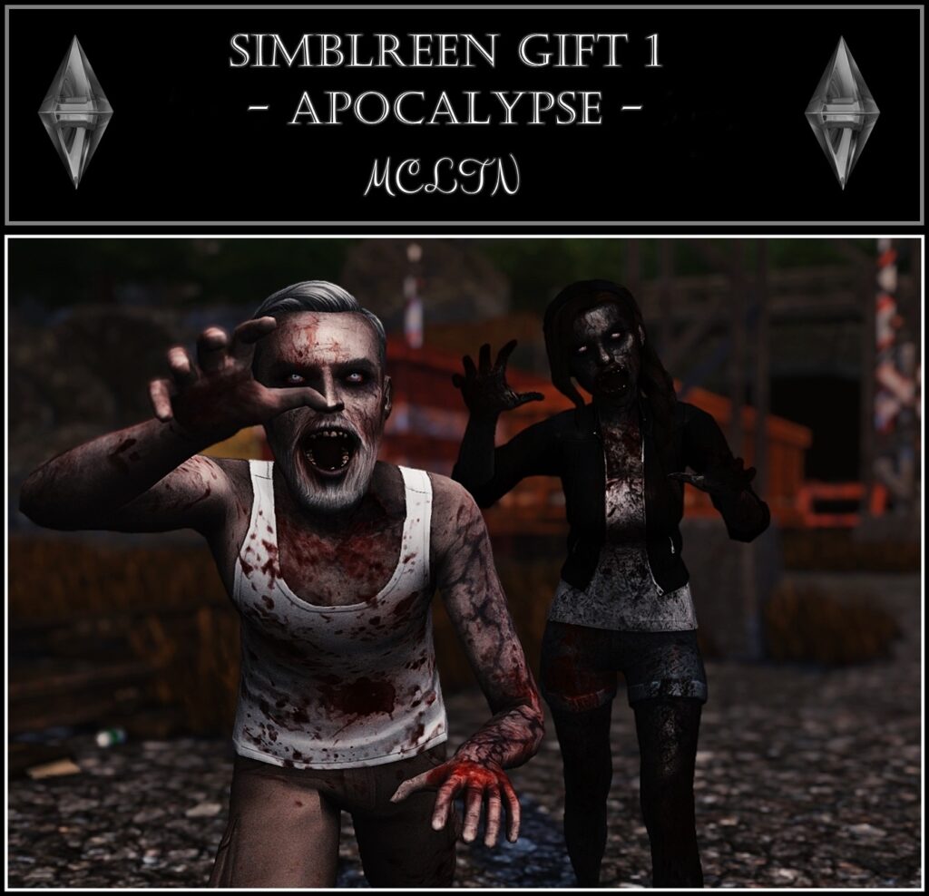 The legendary Simblreen Apocalypse CC pack that took the community by storm — featuring dirty clothes overlays, rotten flesh overlays, zombie blood, standalone infection veins, zombie eyes in four phases, standalone bites in multiple body positions, and eyebag details. An absolute masterpiece of zombie CC.