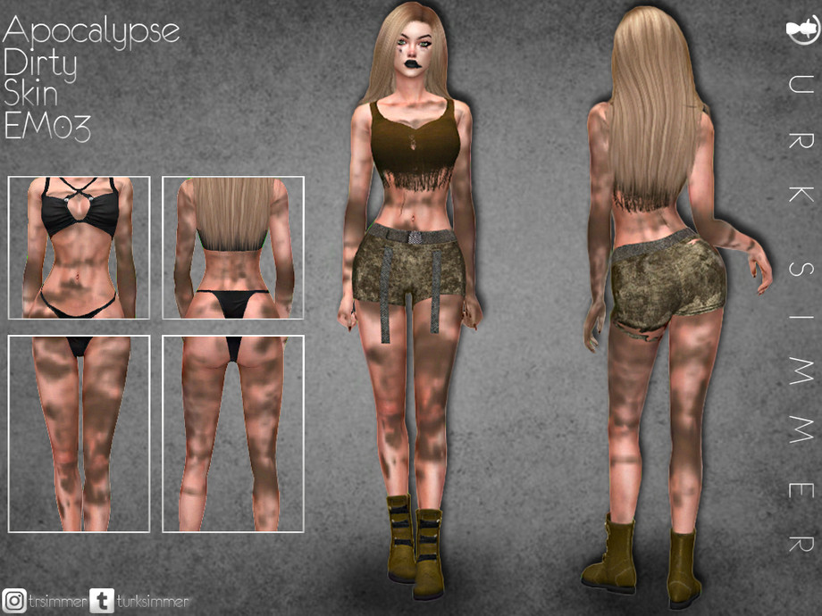 A masterfully crafted post-apocalyptic dirty skin overlay for your Sims that makes them look genuinely worn, exhausted, and grimy from surviving the end of the world. The EM03 version features realistic dirt, bruising, and weathering that works across all skin tones for authentic survivor aesthetics.