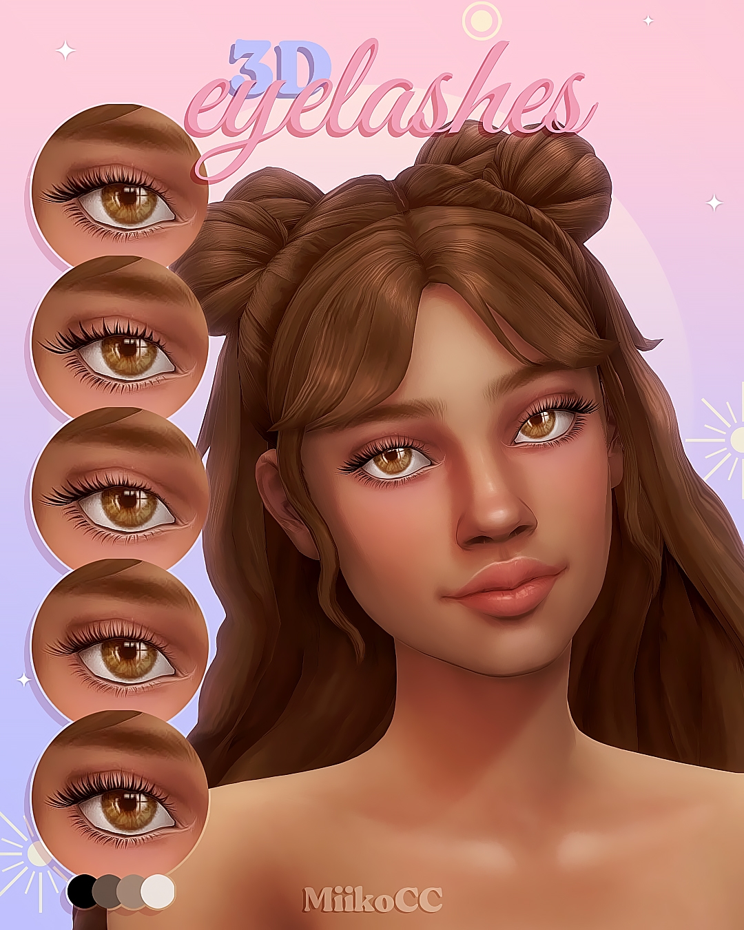 Part three of Miiko's beloved eyelash series features three distinct styles: fox eyes for a sultry look, natural for everyday wear, and round for a doe-eyed appearance. Hand-drawn in alpha style, these lashes have artistic quality with four color options per type. Base game compatible and designed to work beautifully with other makeup.
