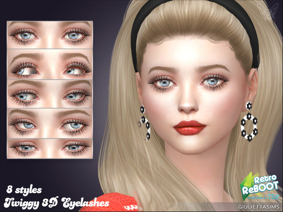 Inspired by the iconic 1960s model Twiggy, these lashes capture vintage glamour with modern 3D quality. The retro style features dramatic lower lashes and distinctive upper lashes that were signature to the mod fashion era. Perfect for creating period-appropriate Sims or adding a touch of vintage elegance to contemporary looks.