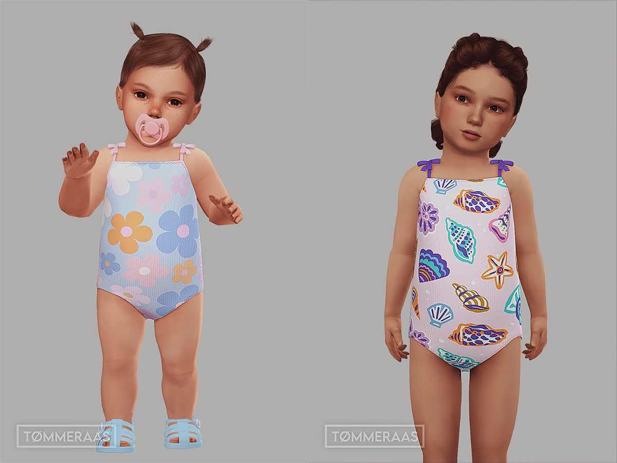 An updated version of a classic swimsuit design, now converted for toddlers with dramatically improved mesh quality and textures. This creator completely overhauled the original rather than just doing a simple age conversion. Available for toddlers, children, and infants in the outfit category with custom thumbnails and 50 swatches.