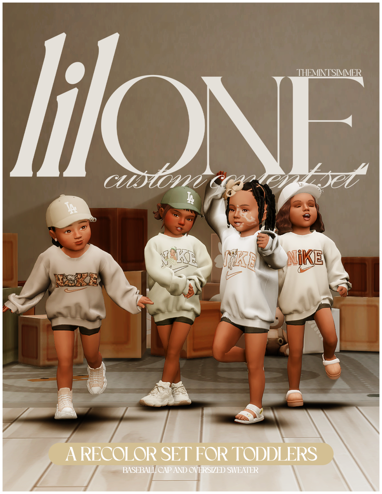 This set includes a girls' oversized Nike sweater (fullbody outfit) with 12 swatches and a unisex LA Dodgers baseball cap with 8 swatches. Created with love for the creator's own toddler Sim, this sporty set adds trendy streetwear vibes to your toddler's wardrobe. All required mesh links are provided on the creator's Patreon.