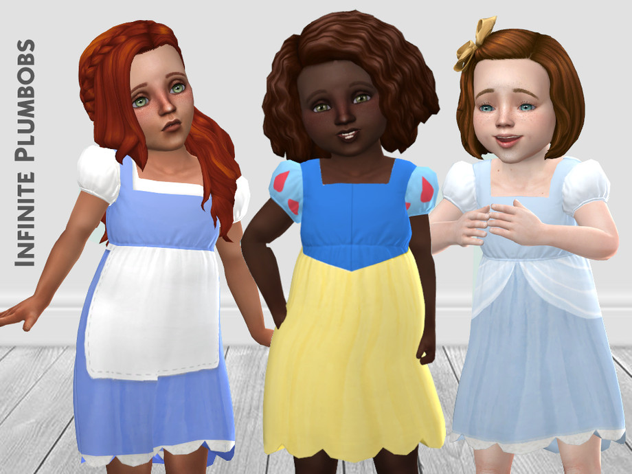 Princess-themed dresses that let your toddler play dress-up or embody their favorite fairy tale character! This collection includes 9 swatches suitable for females and works as a base game recolor. Perfect for when your little one wants to feel magical, whether it's for pretend play or a fancy dress party.